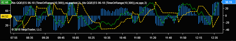 Our QQE has an option that permits users to plot difference between the two plots. Here we see that in a blue histogram.